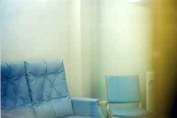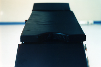 In one sequence of images Hock places the viewer within the framework of a hospital. The photographs showing objects such as the pillows and sheets, seats in a waiting room, and finally the operating table.